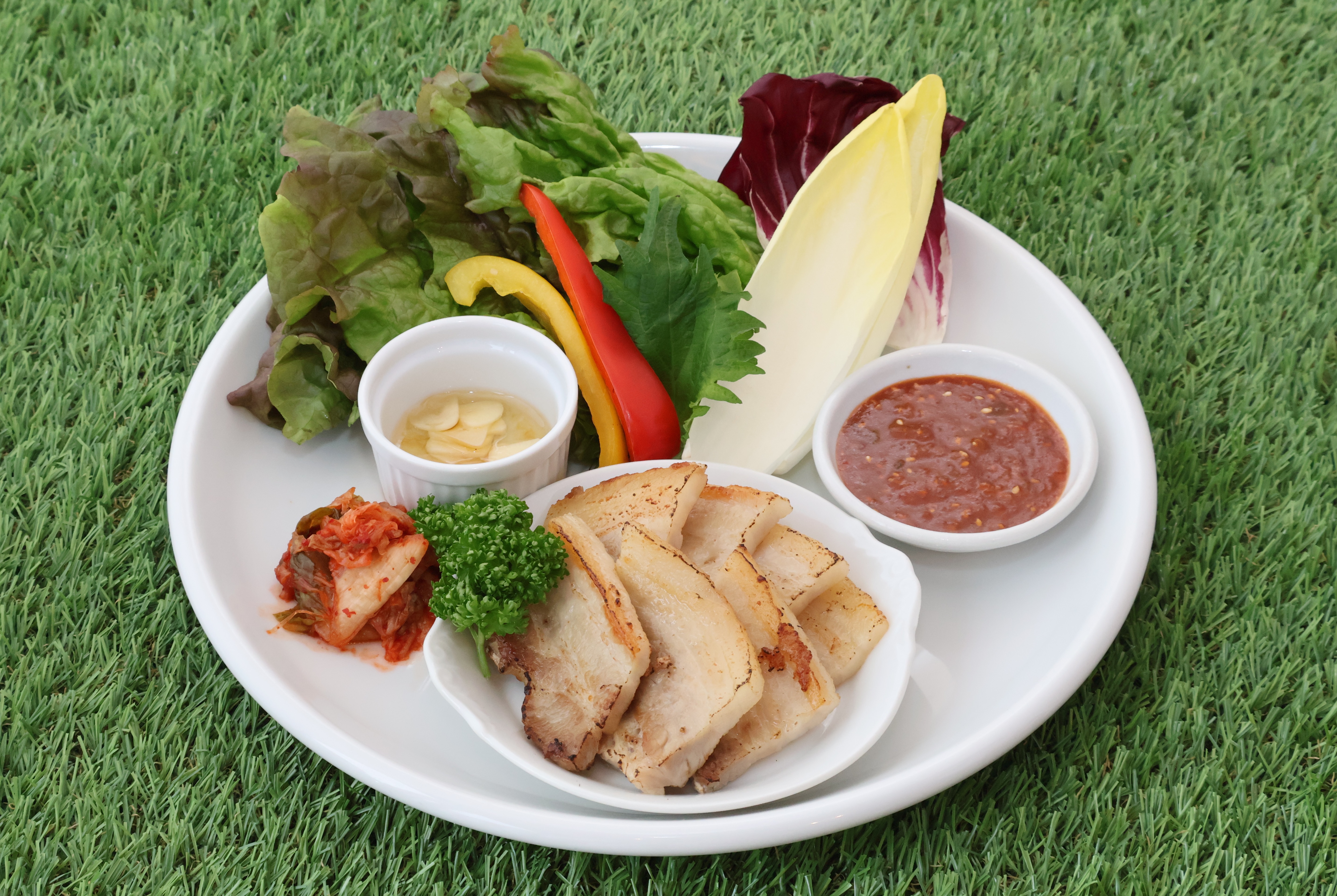 厚切り豚バラ肉を香ばしく焼き上げ、サンチュで包んで楽しむ韓国定番の焼肉。ジューシーな旨みとキムチやニンニク、サムジャン(味噌+コチュジャンの甘辛だれ)をお好みで併せてお召し上がり下さい。【にんにくを使用しております】