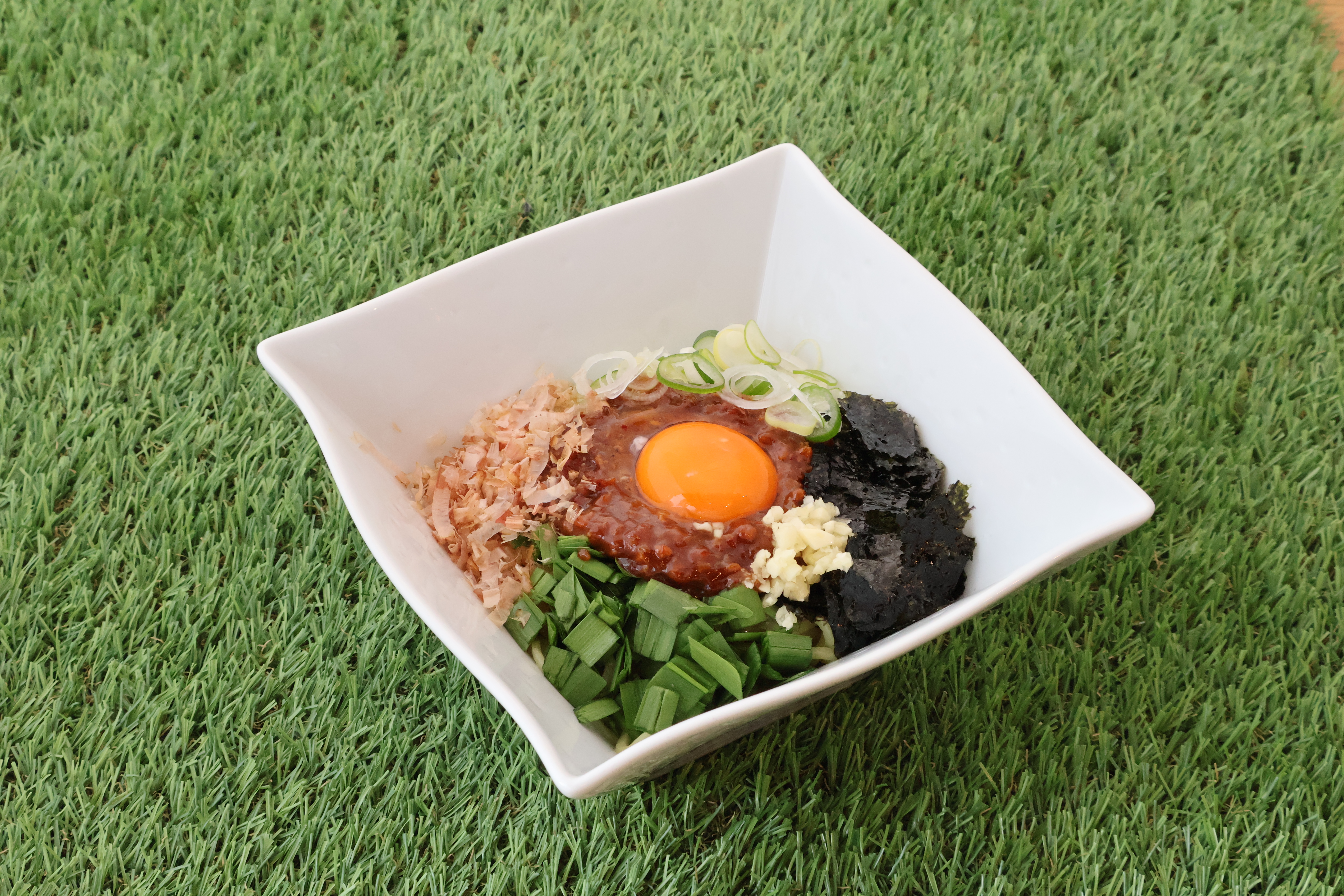 濃厚な旨辛ミンチと香り豊かな薬味を贅沢に絡めて味わう、上質な汁なし麺。卵黄が全体をまろやかに包み込む深みある一杯。【にんにくを使用しております】