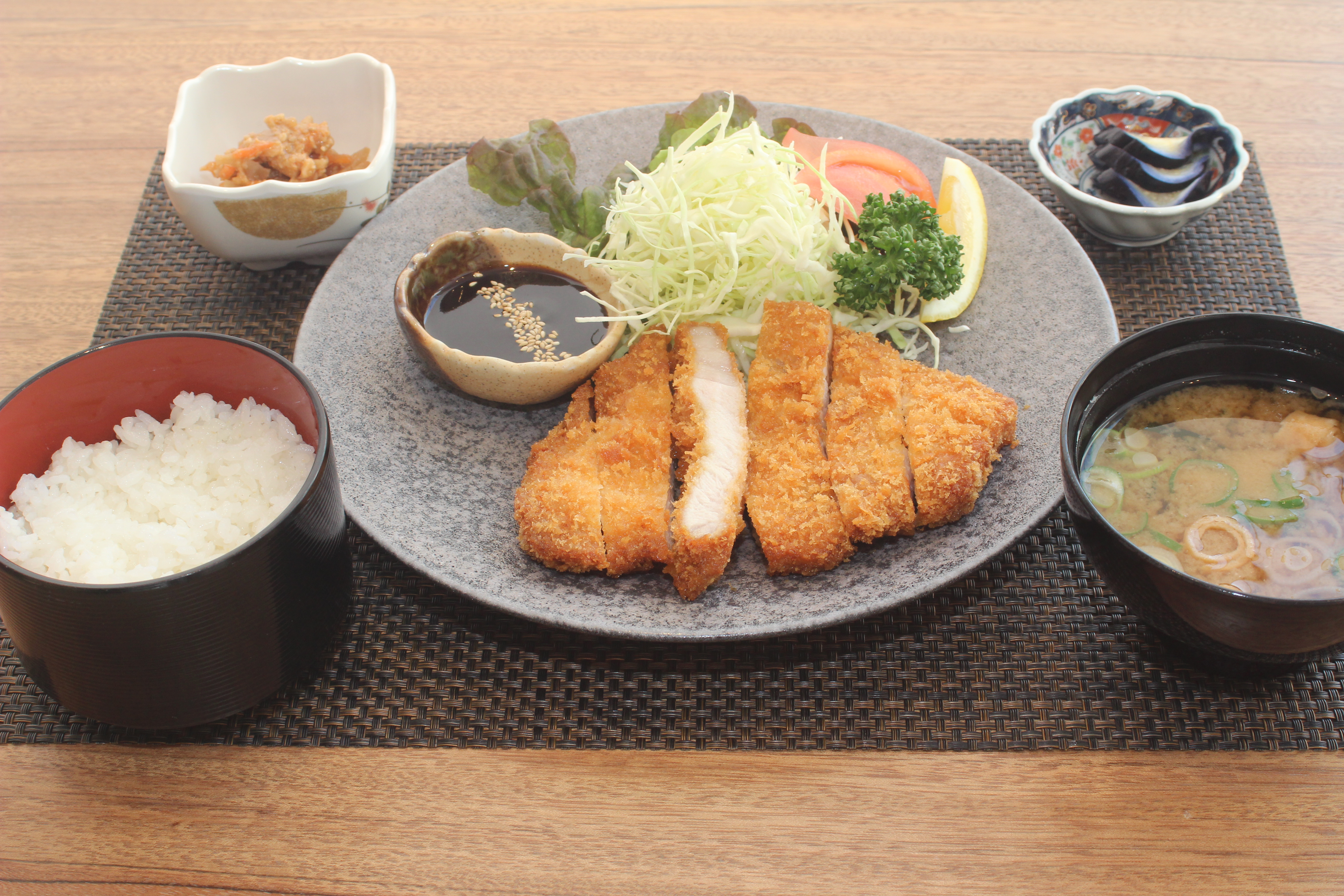 みやぎのポークの厚切りとんかつ / 本日の小鉢 / 香の物 / ご飯 / お味噌汁 / デザート