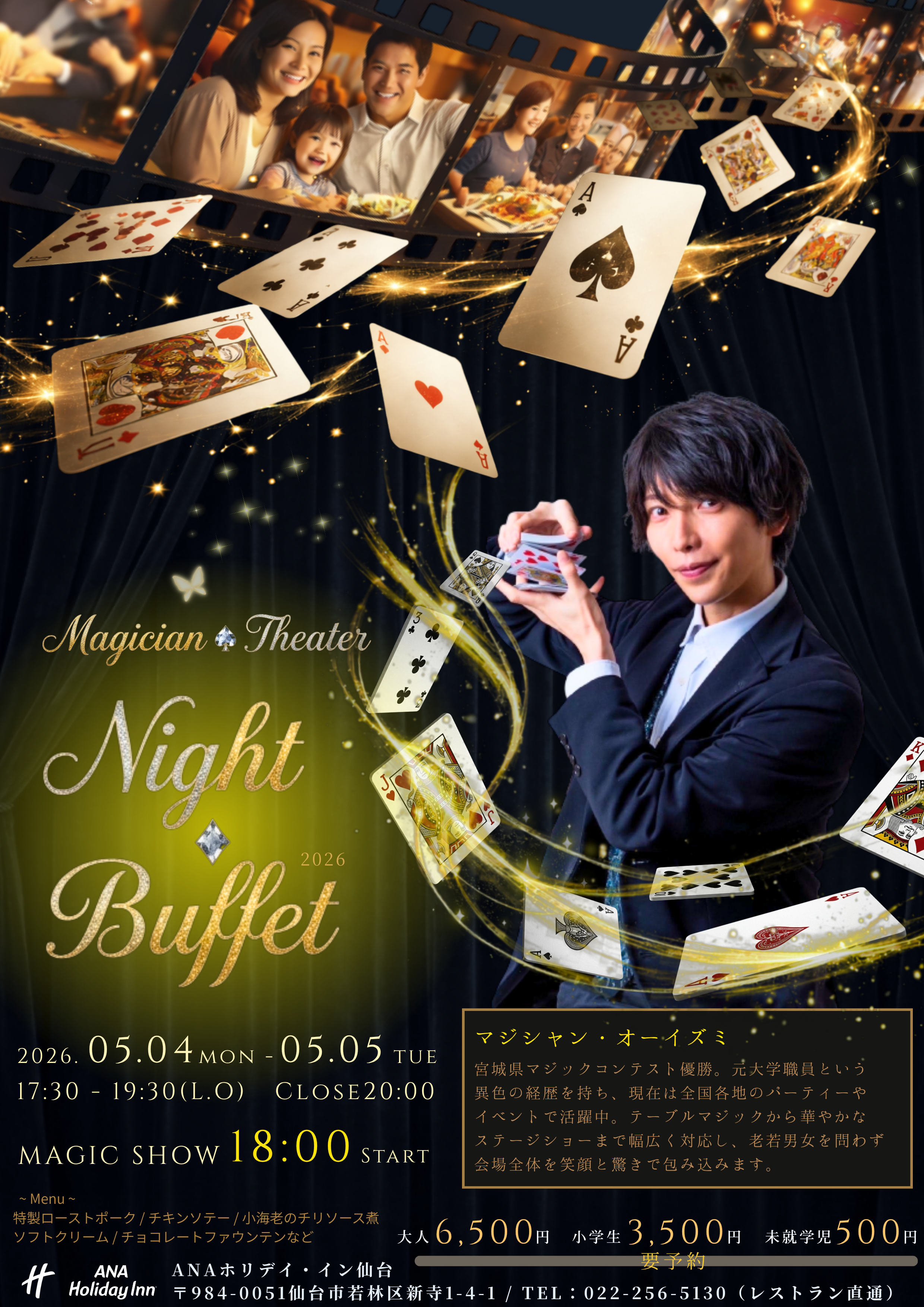 Magician Theater Night Buffet 2026 | ANAホリデイ・イン仙台 ANA Holiday Inn Sendai · Special Event Magician Theater Night Buffet — 2026 — ♠ SPADE ♣ CLUB ♥ HEART ♦ DIAMOND あなたの目の前で、不可能が起きる。 美食と魔法が交差する、夢の宴へ。 Date & Time 2026.05.04 MON — 05.05 TUE 17:30 – 19:30 (L.O.) CLOSE 20:00 ✦ MAGIC SHOW ✦ 18:00 START Tonight’s Performer マジシャン オーイズミ 宮城県マジックコンテスト優勝。元大学職員という異色の経歴を持ちながら、現在は全国各地のパーティーやイベントで活躍中。テーブルマジックから華やかなステージショーまで幅広く対応し、老若男女を問わず会場全体を笑顔と驚きで包み込む実力派マジシャン。 The Grand Buffet 美食のラインナップ 魔法の夜にふさわしい、シェフ渾身のブッフェ料理。旬の食材を活かした一皿一皿が、テーブルを彩ります。 特製ローストポーク Roast Pork じっくりと低温でローストした、シェフ自慢の特製ポーク。肉本来の旨みを閉じ込めた、しっとりとした食感と芳醇な香りが特徴。特製ソースと季節の付け合わせを添えてお召し上がりください。 その他、チキンソテー、小海老のチリソース煮、ソフトクリーム、チョコレートファウンテン など、多数の料理を取り揃えております。 Admission ご料金 大人 中学生以上 ¥6,500 小学生 小学1年生〜6年生 ¥3,500 未就学児 4歳〜5歳のお子様 ¥500 ※料金はすべて消費税・サービス料込みの価格です。 Venue Information 開催会場について 会場 ANAホリデイ・イン仙台 1階レストラン「シェフズ テーブル」 住所 〒984-0051仙台市若林区新寺1-4-1 電話 022-256-5130 (レストラン直通) 開催日 2026年5月4日(月・祝)2026年5月5日(火・祝)17:30 – 19:30(L.O.) CLOSE 20:00 JR仙台駅から徒歩約6分の好立地です。ゴールデンウィークの特別な二日間、大切な方との思い出づくりに、ぜひご活用ください。 ♠ ♣ ♥ ♦ Reservation ご予約・お問い合わせ 魔法のような夜は、早めのご予約がおすすめです。席数に限りがございますので、ご希望の方はオンラインまたはお電話にてお早めにご連絡ください。スタッフ一同、皆さまのご来場を心よりお待ち申し上げております。 オンラインで予約する — レストラン直通 — 022-256-5130 受付時間:レストラン営業時間内 ANAホリデイ・イン仙台 / ANA Holiday Inn Sendai〒984-0051 仙台市若林区新寺1-4-1